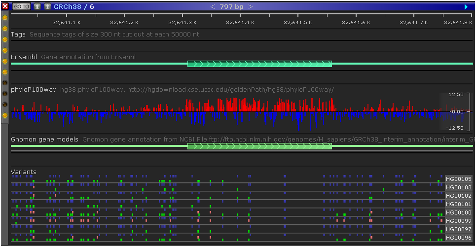 Using bright colors against a dark background enhances the visibility of elements whose color conveys meaningful information. For instance, SNVs that match the reference are typically shown in blue, while mutations appear in red or green. When the Variants track uses a white background, it can be challenging to distinguish the colors of the alleles. The variant colors can be customized so that rendering reference SNVs makes them semitransparent. In this combination, the red and green markers for differences become much more prominent in dark mode.