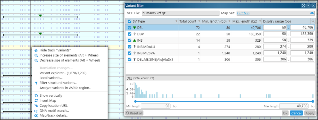 In this interface, we show the length distribution for different types of SV, which can also be used to filter out specific features.