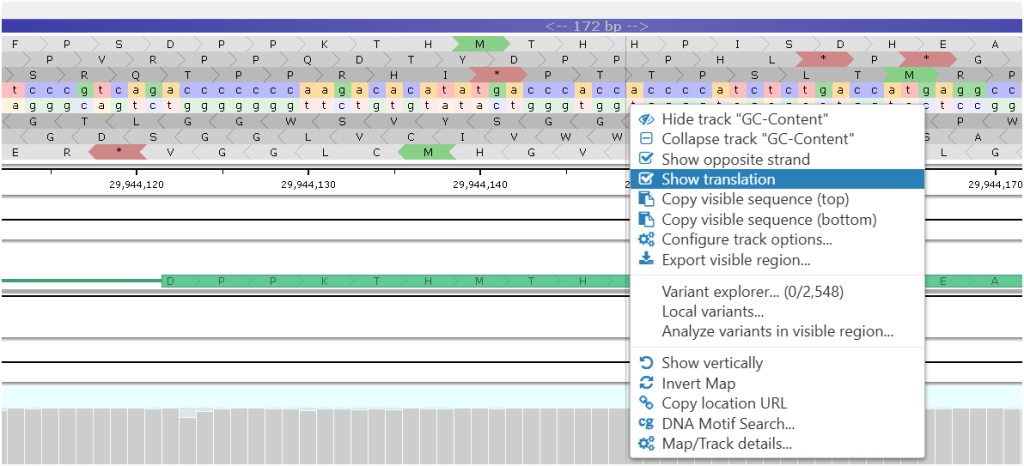 At a certain zoom level, when individual bases are visible, we provide an option to display the genomic sequence translation in 3 frames. Showing the opposite strand can also add three more translation frames. The start and stop codons are marked accordingly.