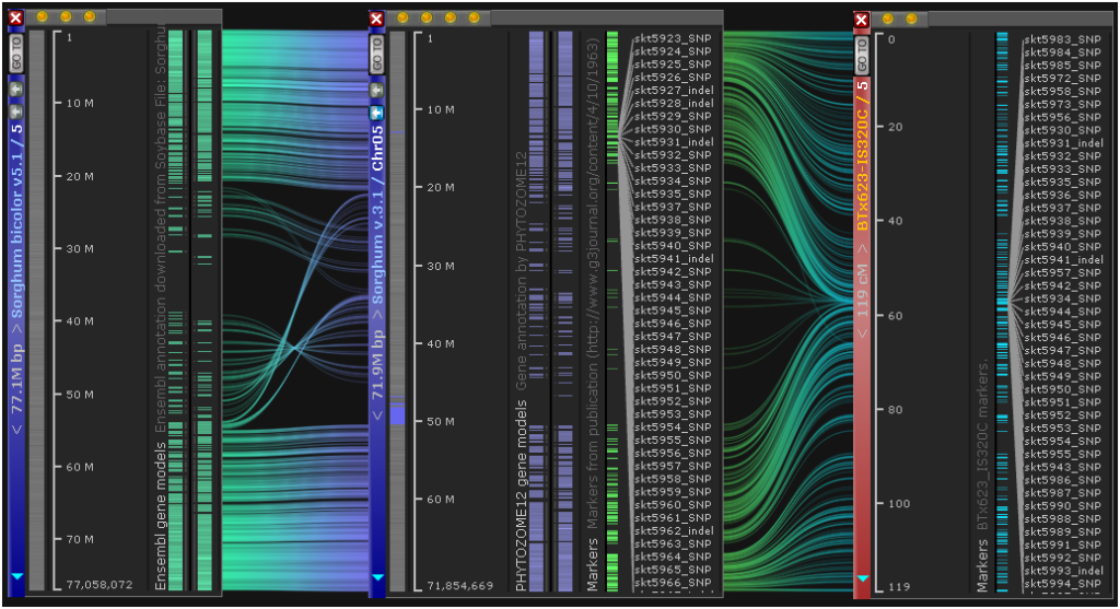 Synteny regions between maps are revealed by linking orthologous genes or common markers. Now you can export these pairs by clicking the button Export visible data in Synteny matrix form. Select two genomes, optionally zoom in on a region of interest, and export the orthologs or marker pairs with their selected properties.